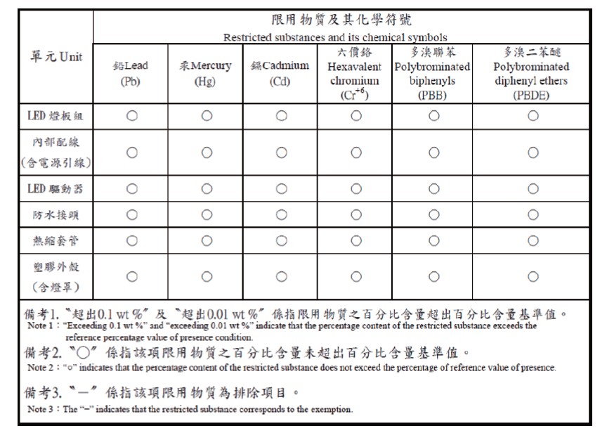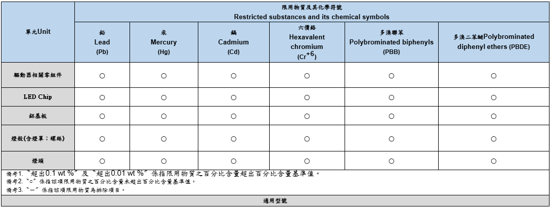 ※ 本公司依管制設備產品清單適用於第5項照明設備Lighting equipment並經RoHS認證之實驗室驗證,提供符合標準的緑色產品。