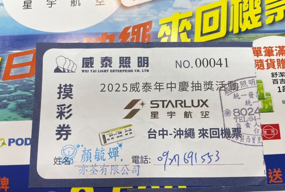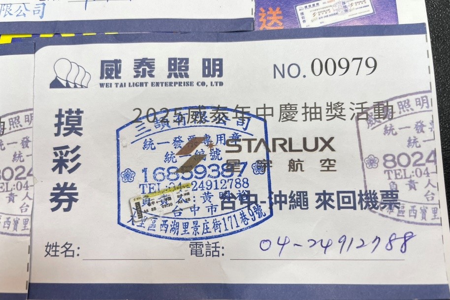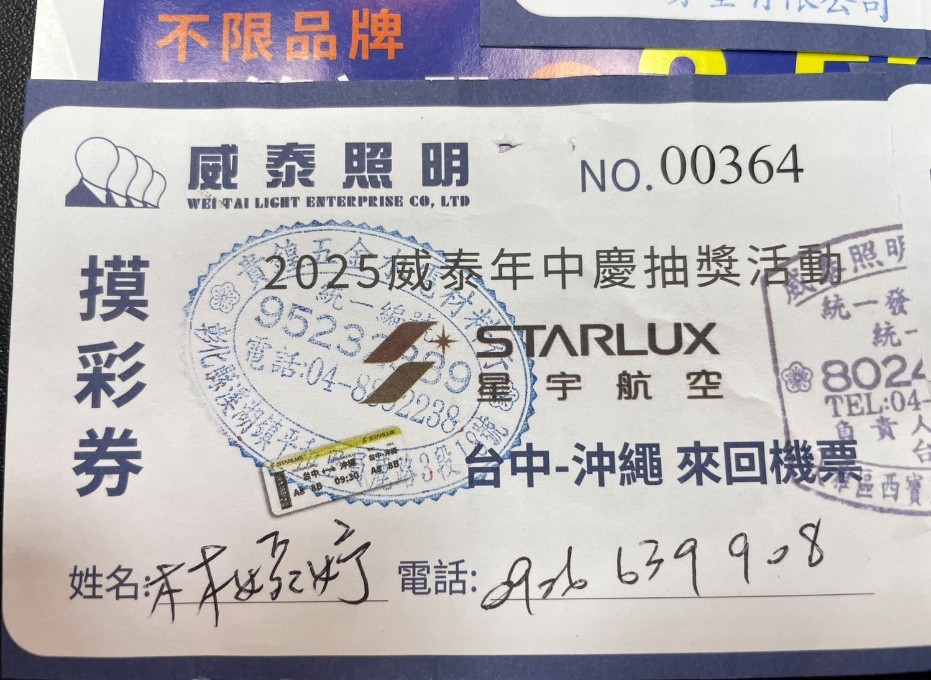 威泰照明24週年年中慶 抽獎活動 沖繩來回機票 於114年7月18日已完成抽獎抽出三位幸運得主 摸彩劵編號與照片如下(依抽出順序排列): 摸彩劵 NO.00041 亦荃有限公司 摸彩劵 NO.00364 貴鍠五金水電材料行 摸彩劵 NO.00979 三頡有限公司